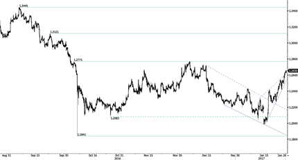 Das Momentum des EUR/USD ist noch immer sehr positiv trotz einiger Konsolidierung. Ein stündlicher Widerstand befindet sich beim Widerstand, der durch die obere Begrenzung des Aufwärtstrendkanals bei etwa 1,0800 markiert wird. Eine stündliche Unterstützung zeigt sich bei 1,0590 (Tief vom 19. 1. 2016) und bei 1,0341 (Tief vom 3. 1. 2017). Erwarten Sie ein weiteres Anziehen der Kurse in Richtung 1,0800. Langfristig deutet das Todeskreuz von Ende Oktober auf eine weitere bärische Tendenz hin. Das Paar hat die wichtige Unterstützung bei 1,0458 (Tief vom 16. 3. 2015) durchbrochen. Ein wichtiger Widerstand liegt bei 1,1714 (Hoch vom 24. 8. 2015). Erwarten Sie eine Bewegung in Richtung Parität.